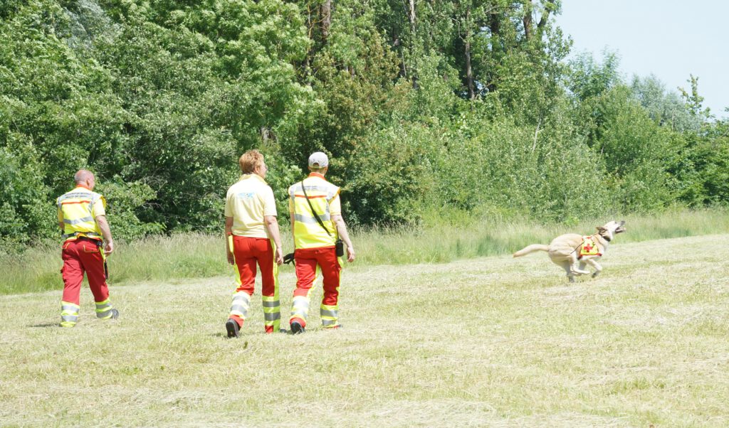 Nach erfolgreicher Suche kehren Nonook, sein Hundeführer und die Helferinnen zur Einsatzleitung zurück